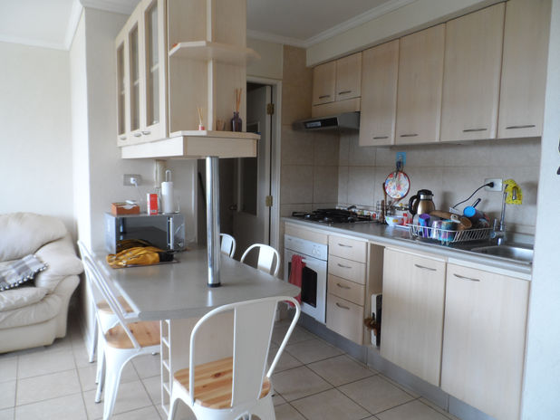 2 dormitorios, 1 baño, cocina equipada, living comedor, terraza cerrada, logia, 1 estacionamiento.